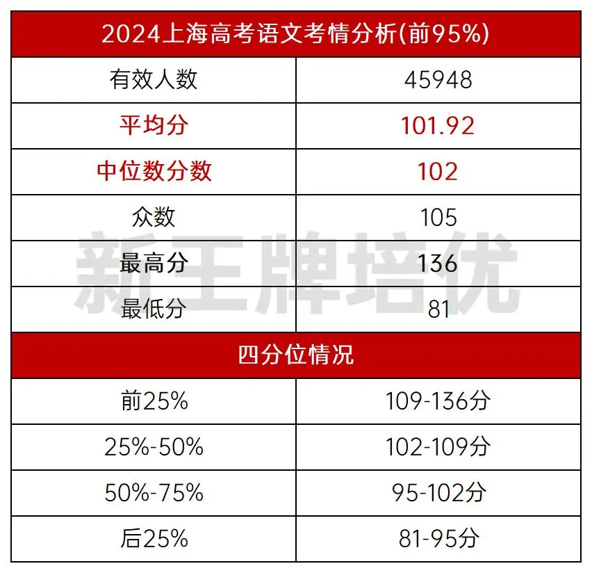 2024年上海高考语文均分为101.92分,中位分数102分,最高分136分,最低分81分。