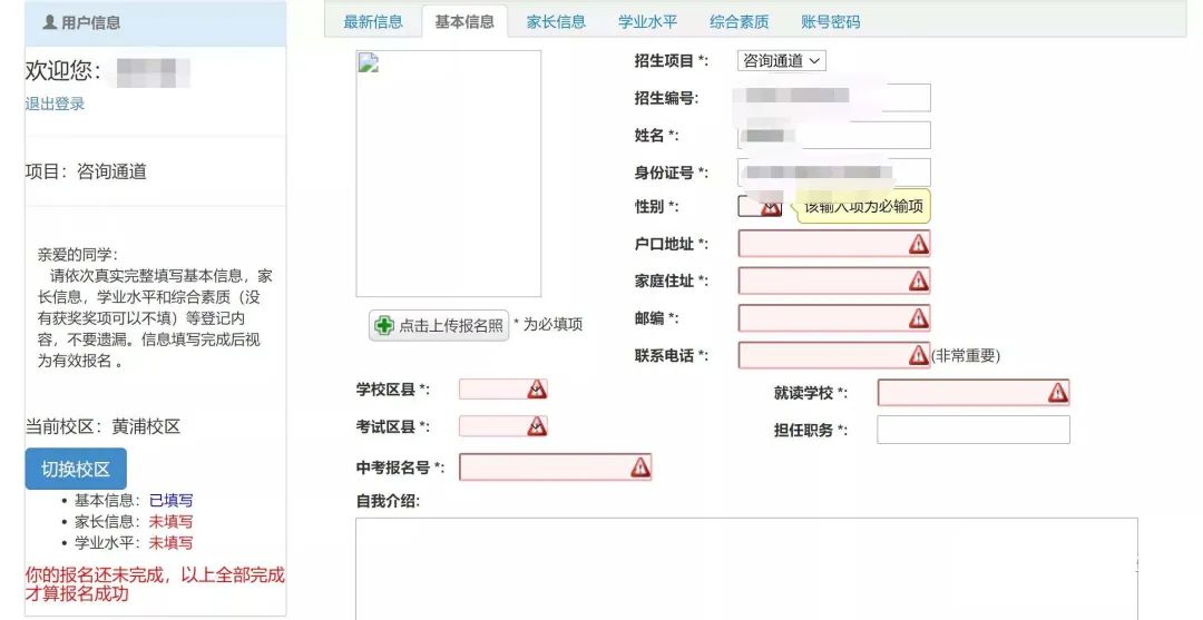 ③ 注册后登陆,选择意向校区,然后完善信息: